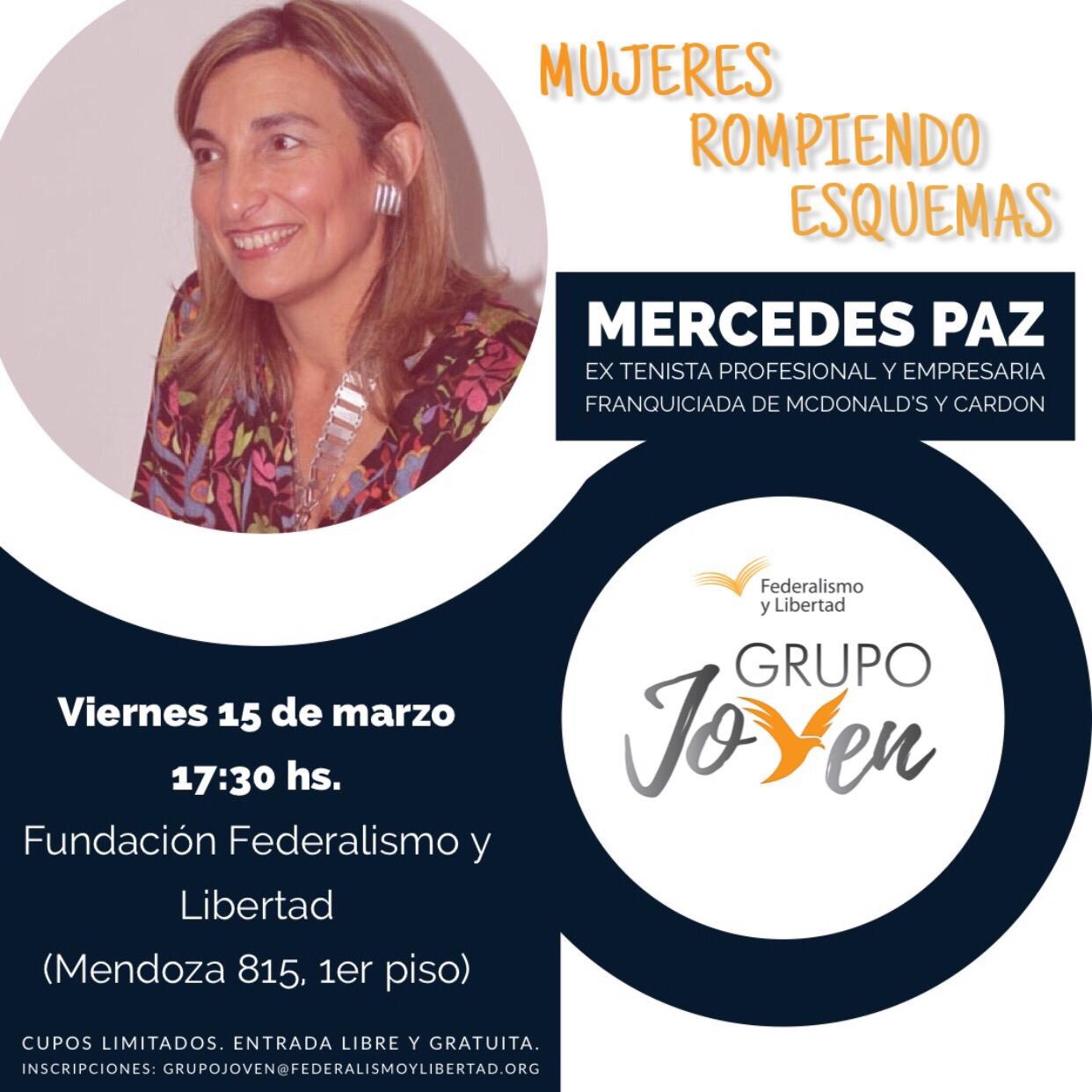 El Grupo Joven de la Fundación Federalismo y Libertad invita este 15 de marzo a la segunda edición de “Mujeres rompiendo esquemas” con Mercedes Paz, ex-tenista profesional y actual empresaria franquiciada de McDonald’s y Cardón.