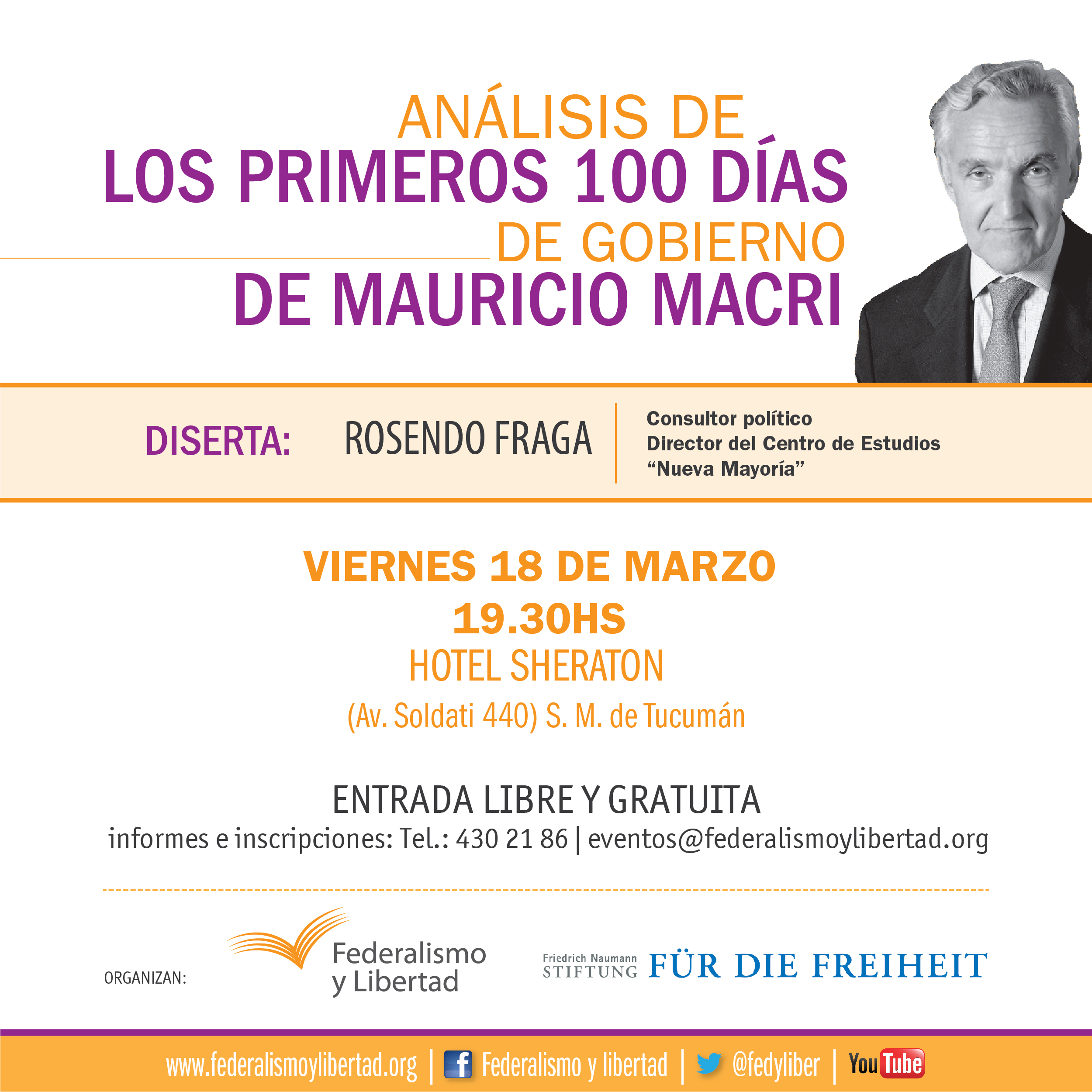 La Fundación Federalismo y Libertad junto a la Fundación Friedrich Naumann organizan una Jornada de Análisis sobre los primeros 100 días del gobierno de Mauricio Macri, que se realizará el viernes 18 de marzo a las 19:30 horas en el Sheraton Tucumán Hotel (av. Soldati 440, San Miguel de Tucumán).